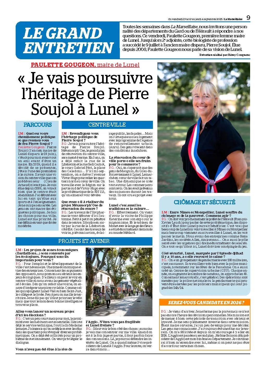 Fin août 2025, le journal a consacré son grand entretien à Paulette Gougeon, maire de Lunel. Elle y revient sur son parcours, sa vision pour le centre-ville, les projets d’avenir ainsi que les enjeux de sécurité et d’emploi.